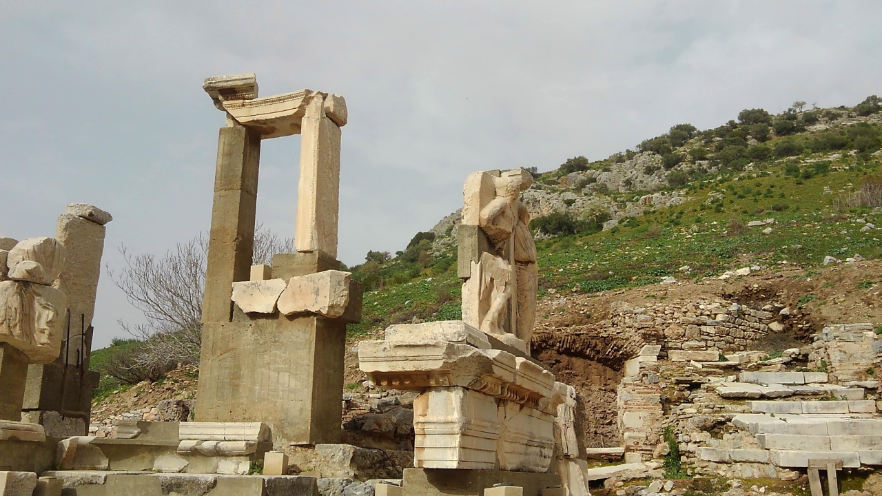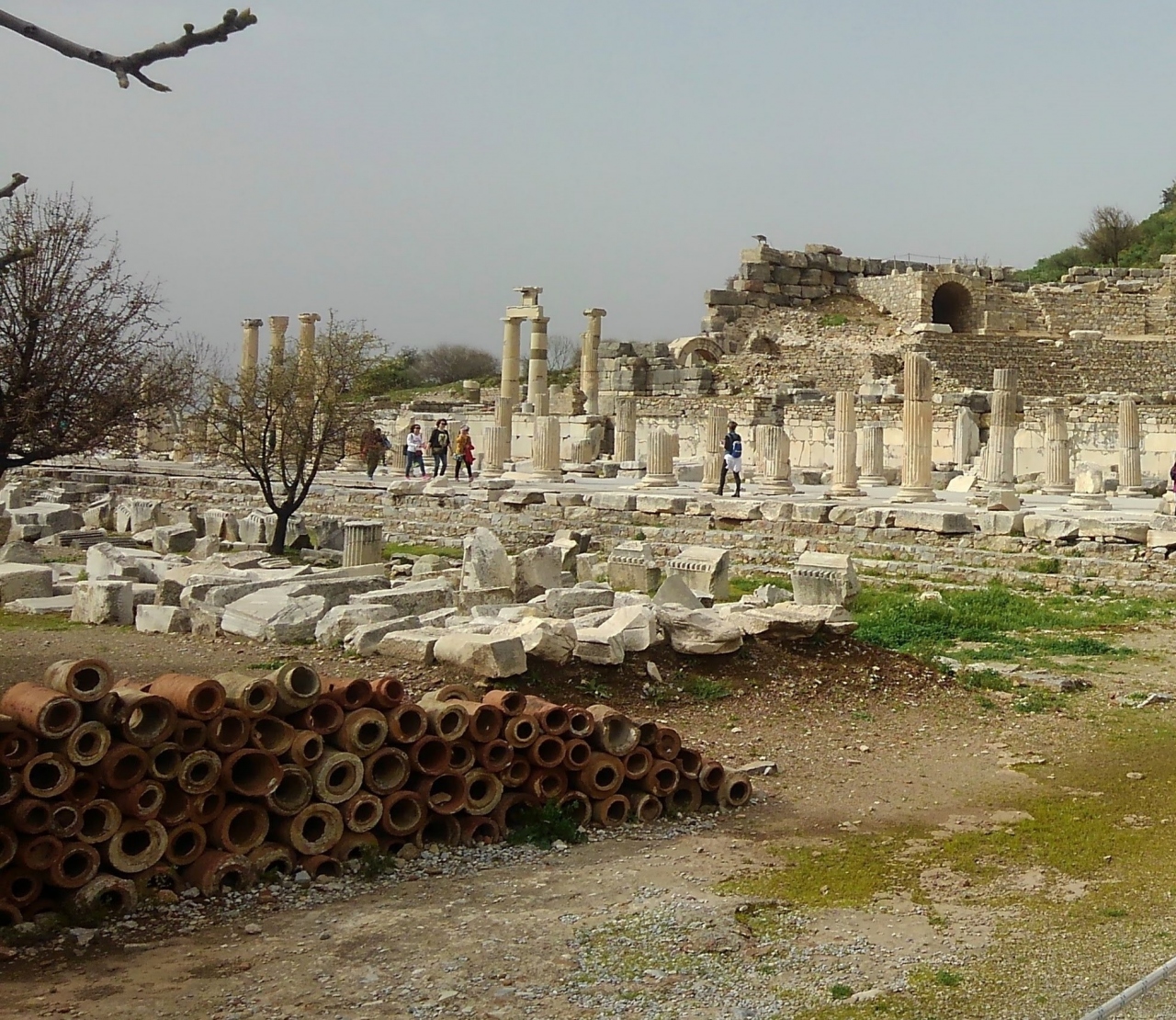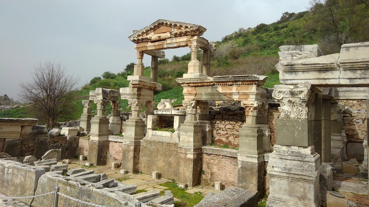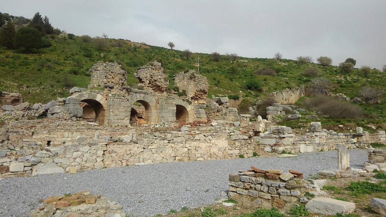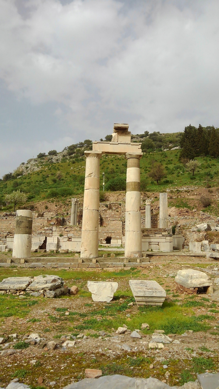 トルコの世界遺産エフェス遺跡にあります。公会堂跡は、今は2本の柱とその上にまたがるような石柱のみが残っています。紀元前3世紀頃に建設がはじまり、拡張を続けローマ帝国のアウグストゥス帝の時代に完成したとのことです。ヘスティアの聖なる場所と呼ばれ、ここに灯されたヘスティアの聖火は 数百年に渡って守り続けられたそうです。