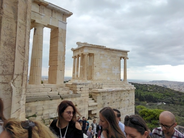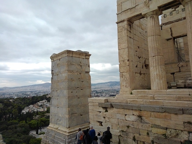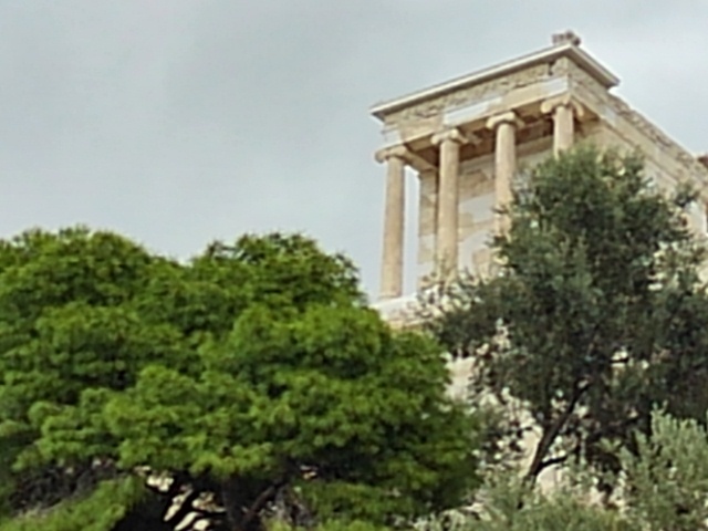 アクロポリスの前門(プロピュライア)を登る途中から右方向に見えてきます。神殿には前面に4メートルのイオニア式列柱が4本、背面にもイオニア式列柱が4本あります。紀元前5世紀の建造です。現在の物はギリシャ独立後の復元によるとのことです。アテナニケ神殿は「翼なきニケの神殿」とも呼ばれます。アテネ市民が戦いに常に勝利するように、勝利の女神がどこにもいかないようにと願い、ここに 翼を奪った勝利の女神の木像を置いたそうです。長く続くスパルタとの戦争のある都市国家であると言う 悠久の歴史の流れを感じます。小さいけれど美しい神殿は印象的です。