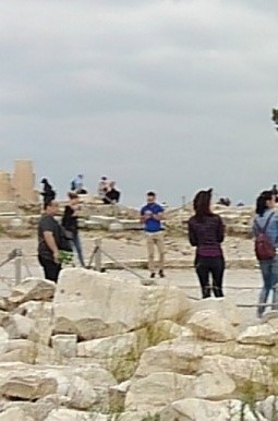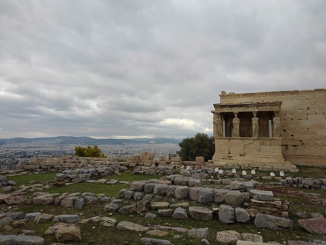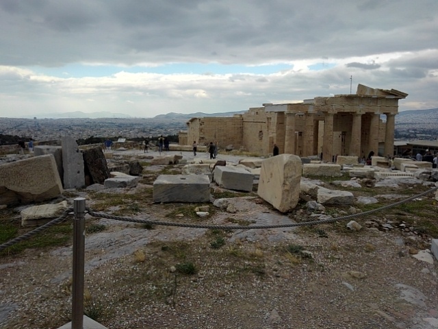 アクロポリスの丘 エレクテイオン神殿とパルテノン神殿の間くらいにあった神殿と大きな像です。神殿は紀元前6世紀に建てられ パルテノン神殿よりも古い神殿と言うことができます。紀元前480年にペルシャによって破壊され、現在は礎石などが残っているだけです。この神殿は 大理石ではなく石灰岩で建てられていて、古代ギリシアの女神アテナを祀っています。アテナ像は高さが約9m。かつての偉大な姿は 想像つかない跡地となっています。