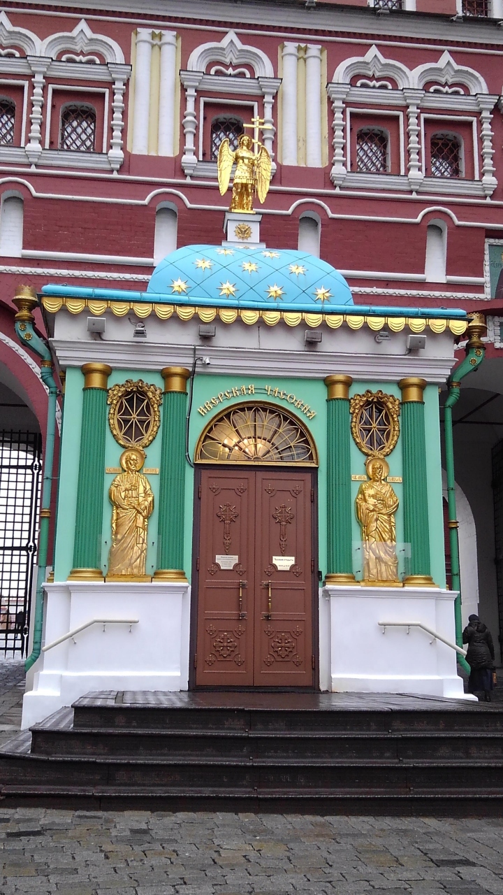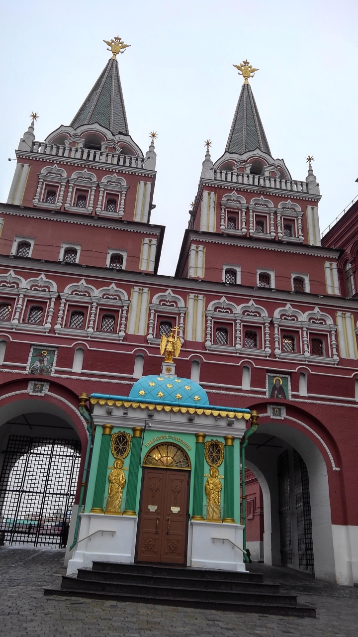 マネージナヤ広場から赤の広場への入り口で 二つ尖塔があります。17世紀に建てられたそうですが、パレードの邪魔になると ソビエト時代に破壊され、1995年に再建されたそうです。門は二つありますが一つは閉まってました。二つの門の間に 一際かわいいイベルスカヤ礼拝堂があります。手前には ロシア全道路の起点のモニュメントがあります。