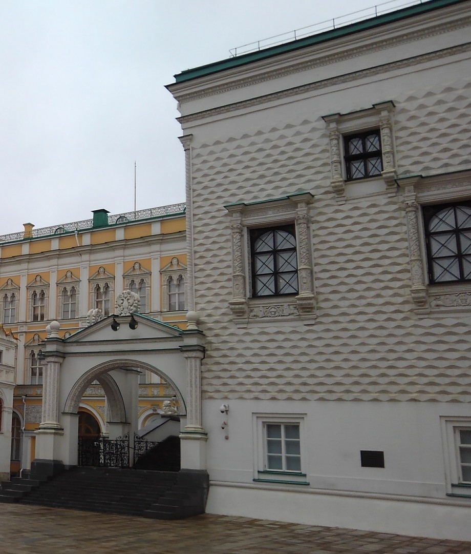 クレムリンの聖堂広場にあります。グラノヴィータヤとは「多面体状」という意味で その名の通り 白い多面体状の石タイルで覆われています。1491年の建築で、 公式行事や海外からの各種レセプションに使われたそうです。プーチン大統領の就任式もここで行われたとのことです。 まわりの煌びやかな金色の玉ねぎドームの建築のなか、非常にシンプルな建物は、つい見落としてしまいそうです。
