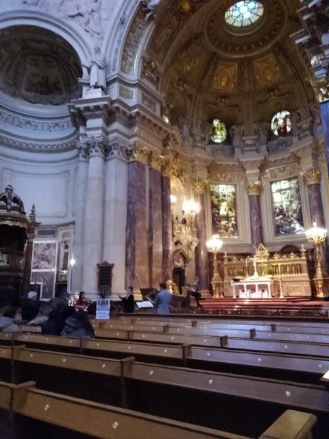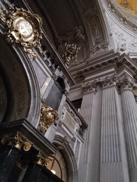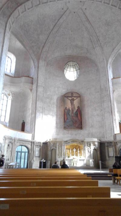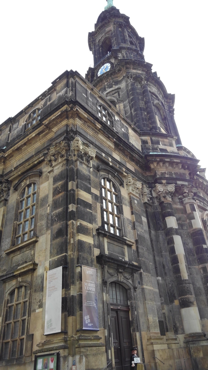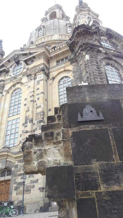 ドレスデンの中心部に建つバロック様式のプロテスタント教会でドーム型をしています。11世紀に始まる歴史ある教会ですが、第二次世界大戦の空襲で焼け落ち、その後復元されました。教会の前には黒く焼けた厚みのある壁がそのまま残されています。再建には、瓦礫8,425個のうち3,500個ほど利用され、「世界最大のジグソーパズル」といわれたそうです。外壁の所々の黒い箇所がそれとのことです。教会の中は、外から想像できない華麗さ。白を基調とする柔らかく優しい装飾に思わずうっとりします。撮影禁止。