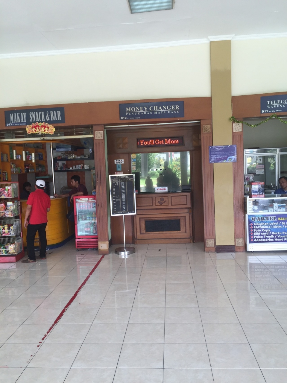 エアーアジアで行くと新しくできたターミナルBに着きます。ターミナルBには両替できるところが見つかりませんでした。300mぐらい東に歩いてターミナルAに両替店がありました。しかし、closeの札がぶら下がっていたのでどうしようか考えていると、その辺りのタクシーの運転手が「今、礼拝に行っているので10分ぐらいで戻ってくる」と教えてくれました。