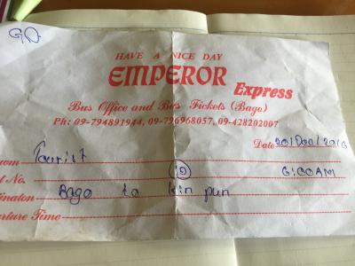 ほど歩いた所に特性チケットブースに案内してくれました。キンプンまでの行きと帰りのチケット2枚を発行してもらい20000Kでした。行きは6時、帰りは14時キンプン発。チケットには、Emperor Expressと印刷されています。バス会社名かと思っていたのですが、実はトラベルエージエシー名で、WIN Expressなら5000Kのところを1000Kで売っています。