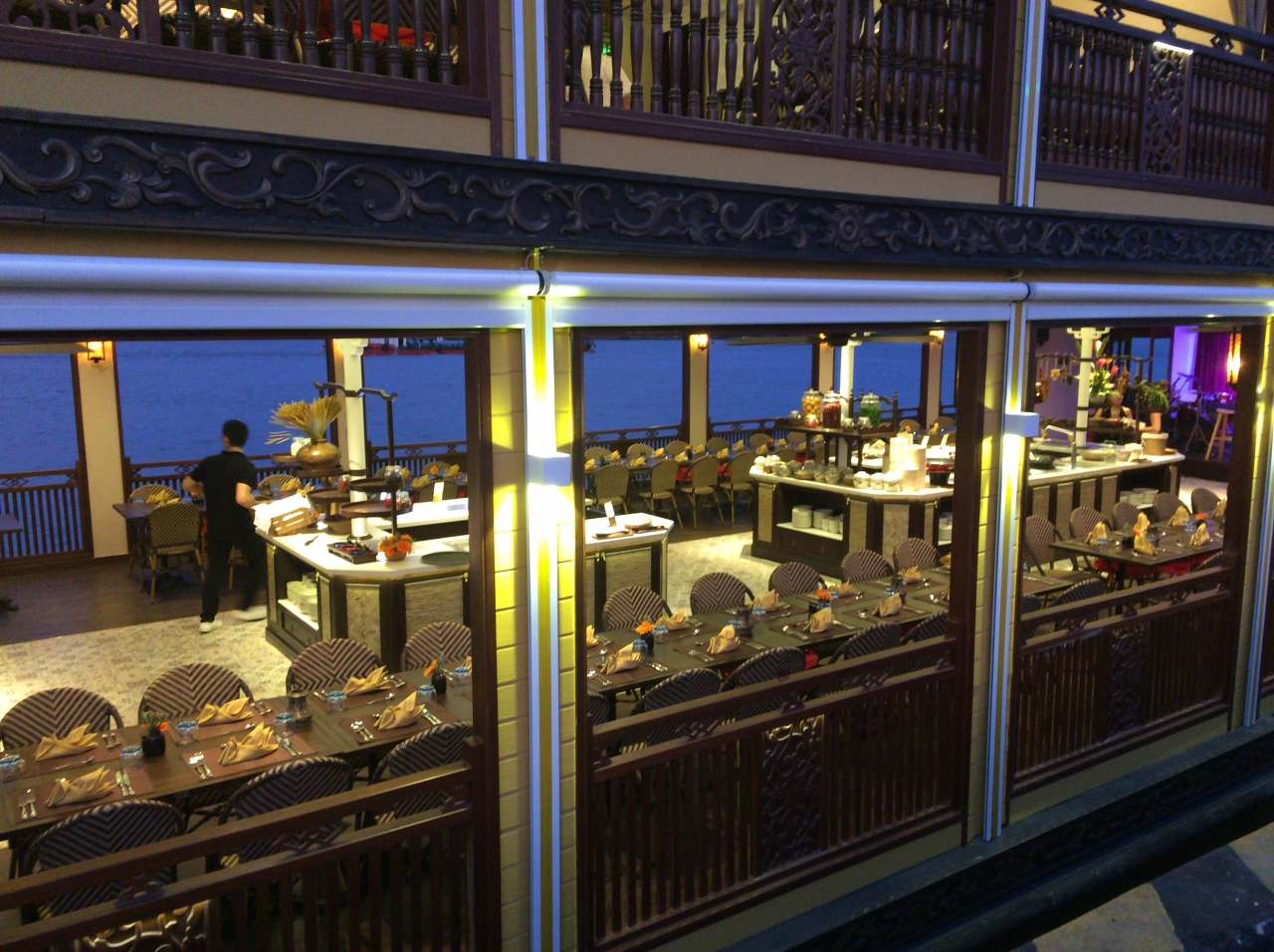ディナークルーズはちょっとお高めですが、ここのディナークルーズは他よりも少しだけ安いです。食事はビュッフェ形式なので、好きなものを好きなだけ食べられますよ。船が出港すると、バンド演奏が始まって賑やかです。帰港する前にはダンスタイムがあり、いい感じに酔っていると参加して楽しめます。 私が参加した日は帰港時刻がちょうど干潮になってしまい、なかなか船着き場に着けず、足止めされました^^;