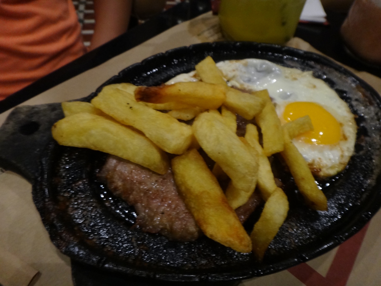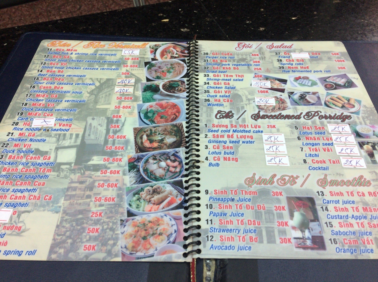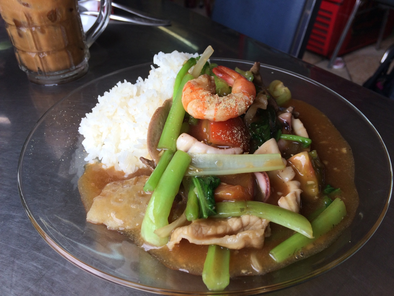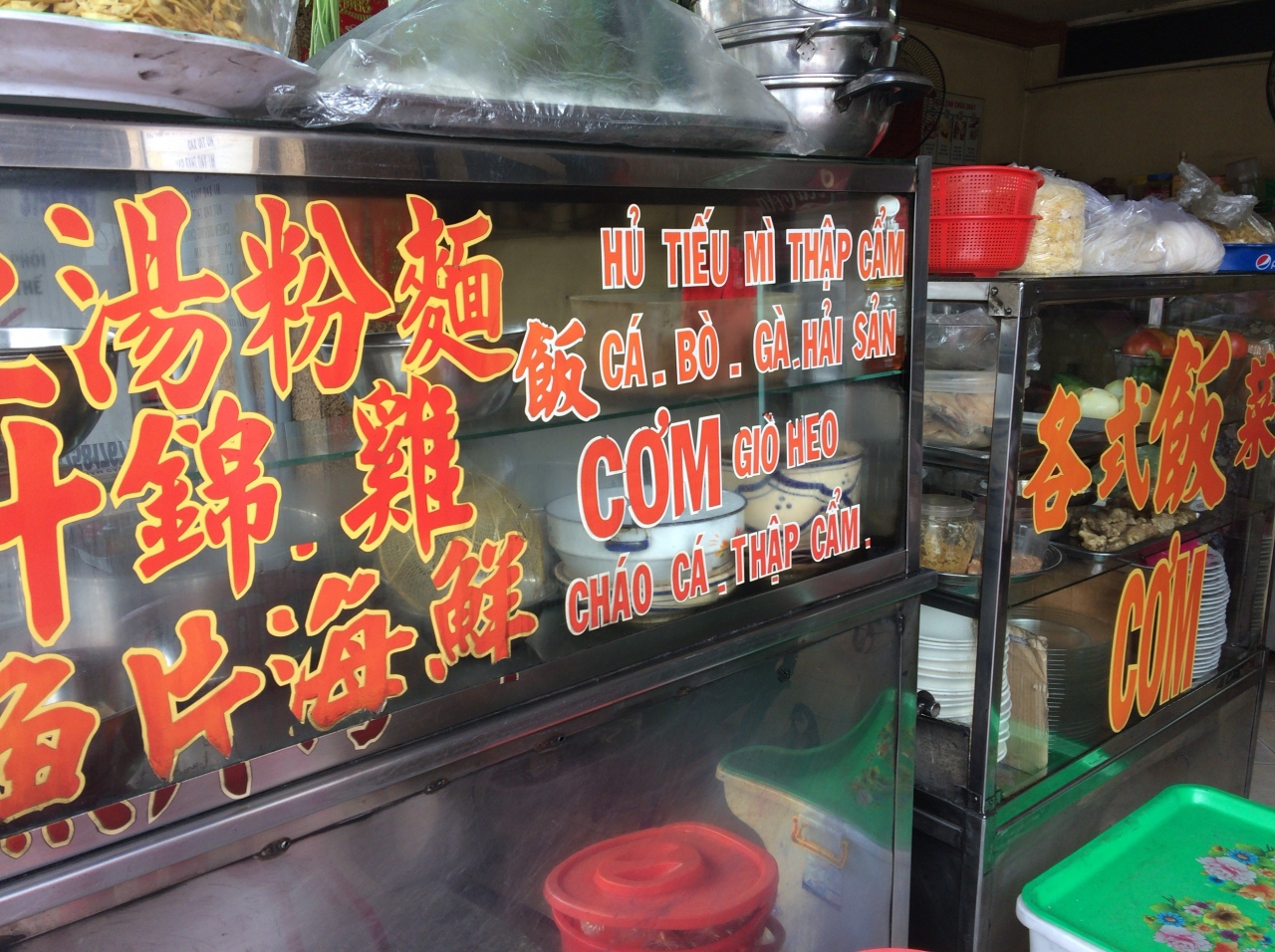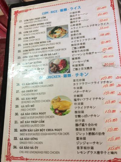 怪しい日本語で書かれたメニューがあります。メニューを見て「混在チャーハン」と書いてあったのでそれを注文したのですが、チャーハンではなく、色々な具材が乗ったあんかけご飯でした(ちなみに中国語でも炒飯と書かれていました)次回はちゃんとしたチャーハンを食べたいと思います。 お店は大きな道沿いにあって、道は騒がしいし、きたないけれど、人間観察をしたり、チョロンの人々の生活を見たりするのは意外と楽しいですよ。 私はけたたましい鶏の声の先を見たら裸のおじちゃんが鶏をさかさまにしてバイクで運んでいる姿を見かけました^^;