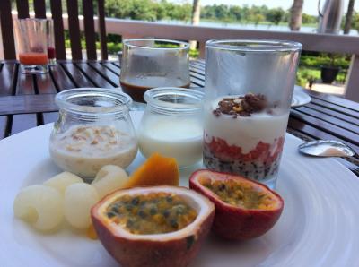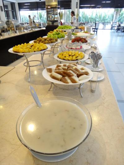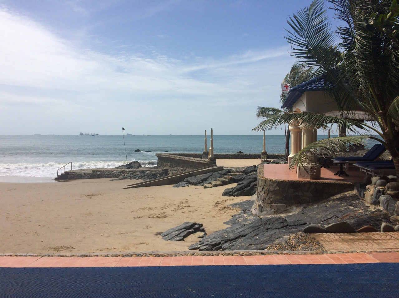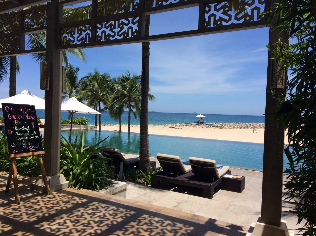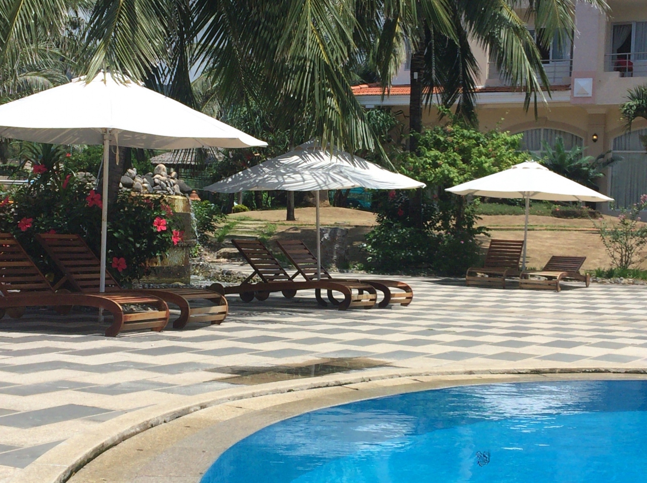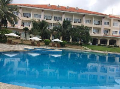 飛行機の到着時刻に合わせて空港までお迎えに来てくれます。チェックイン時刻前に到着しましたが、すぐにお部屋に入ることができました。3階のシービューのお部屋だったので景色もよかったのですが、2階だと木が邪魔して見えないかもしれないなぁと思いました。シービューではない反対側のお部屋は夜になるとカラオケが始まるのでお勧めできはないです...。ベトナム人の宿泊客は朝と夕方に外に出てくるので、昼間はプールもビーチもほぼ貸切状態で、のんびりできました。ホテルの前にはレンタルバイク屋さんがあるのでそこでバイクを借りれば、街中のレストランへ行くのも簡単です。もちろん、タクシーもありますよ。 朝食は6時から9時と早いのですが、日によって6時の時点で準備できていない時もありました。朝食のメニューはベトナム料理中心でした。