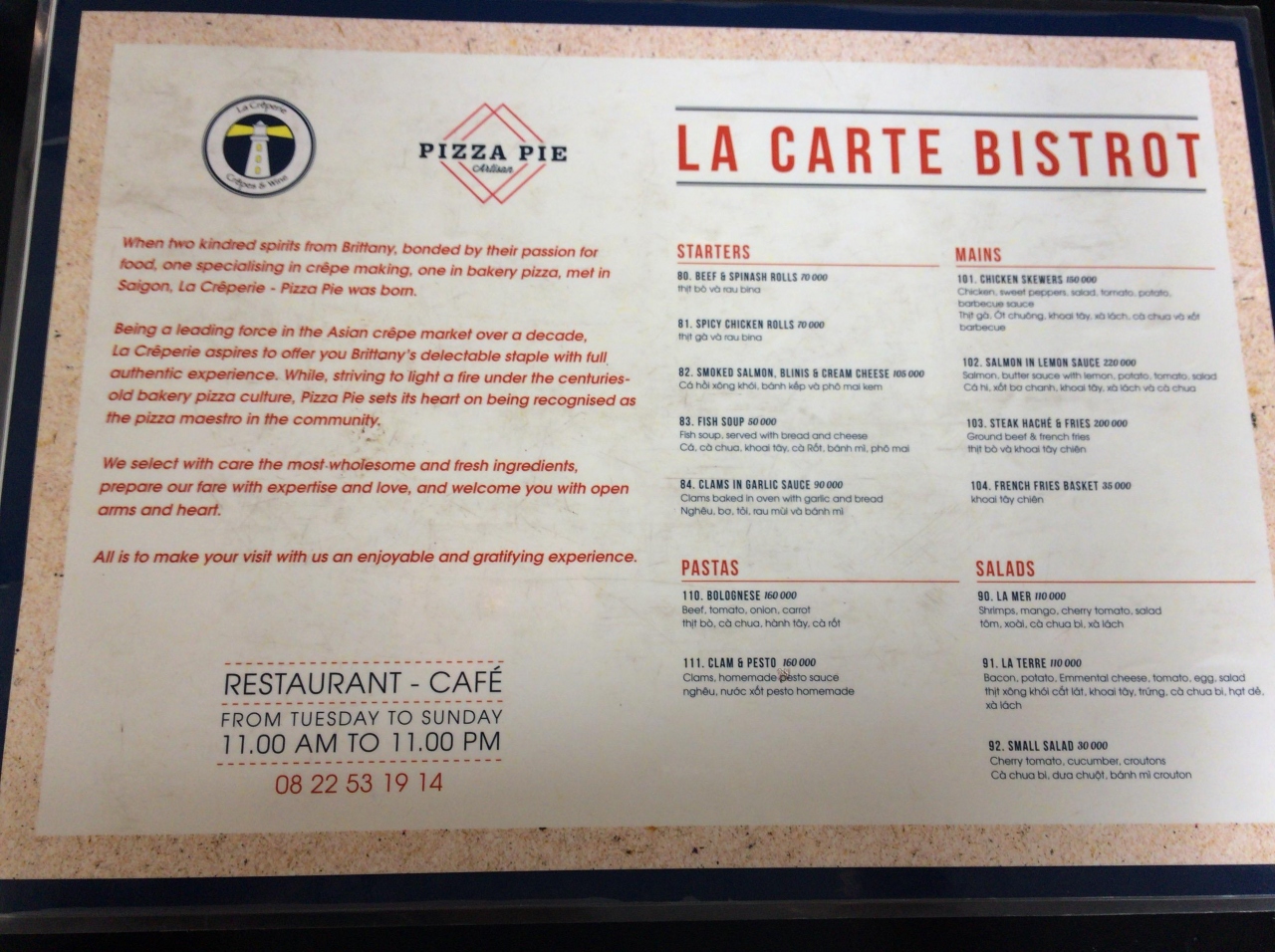 ヘルシーにガレットが食べたくなったらぜひ、ここへ。小さいけれど、清潔で雰囲気のよい店内でおしゃれにガレットが食べられます。ガレットの他にもピザもあり、のんびりとランチをするにはいい場所です。レタントンから9月23日公園の近くに移転しました。Add: 98 O Le Lai P Ben Thanh Q1