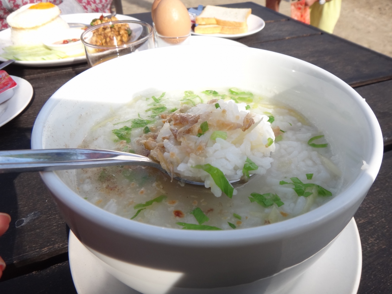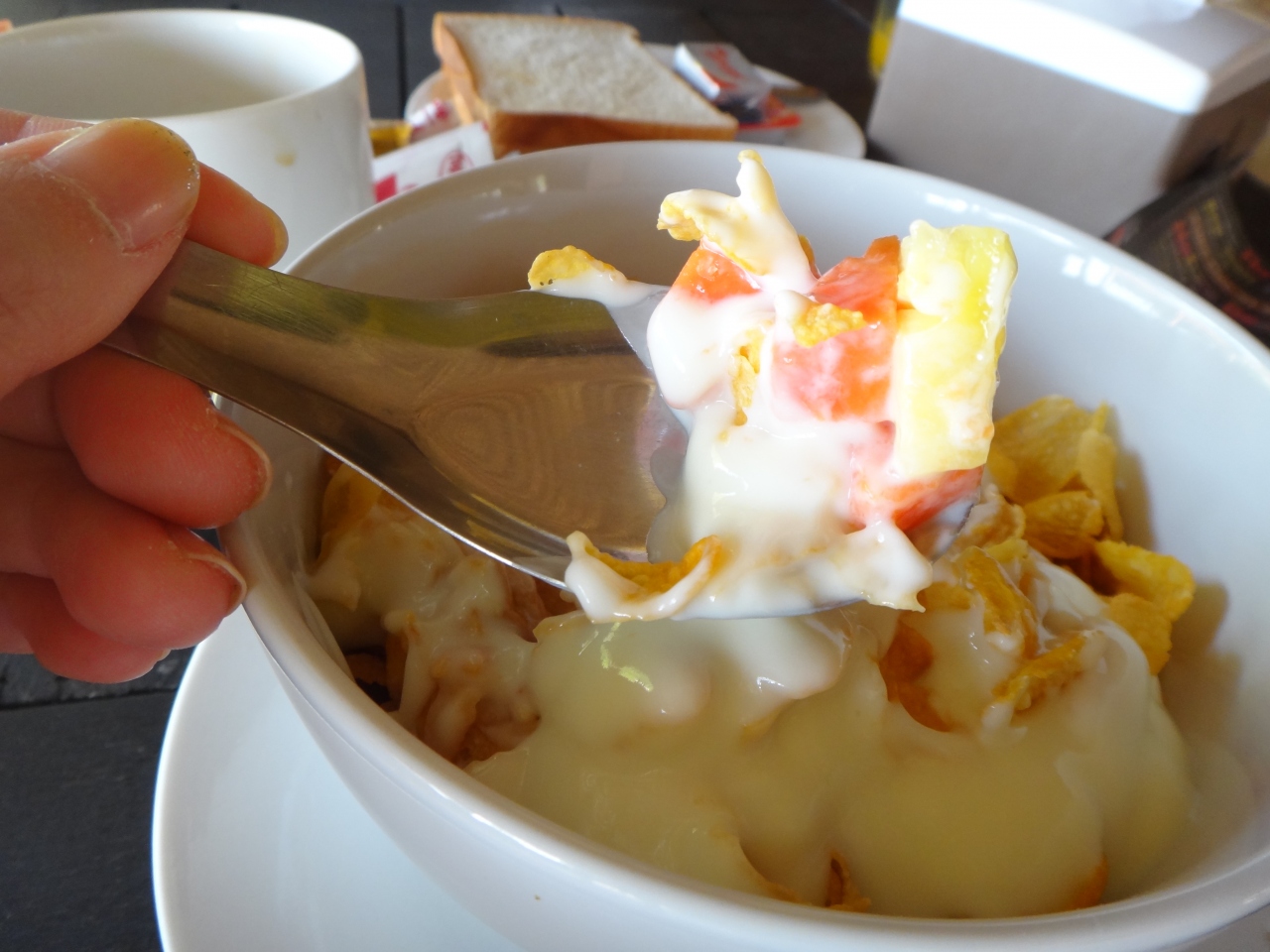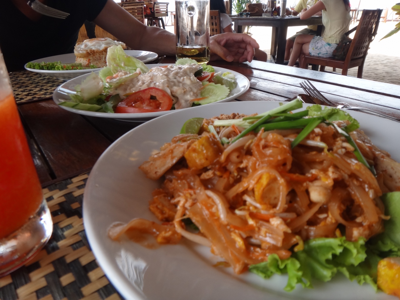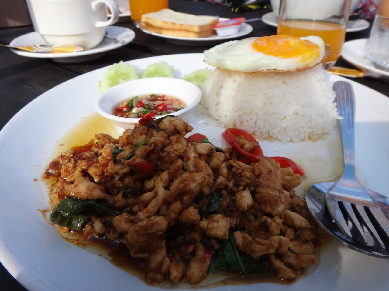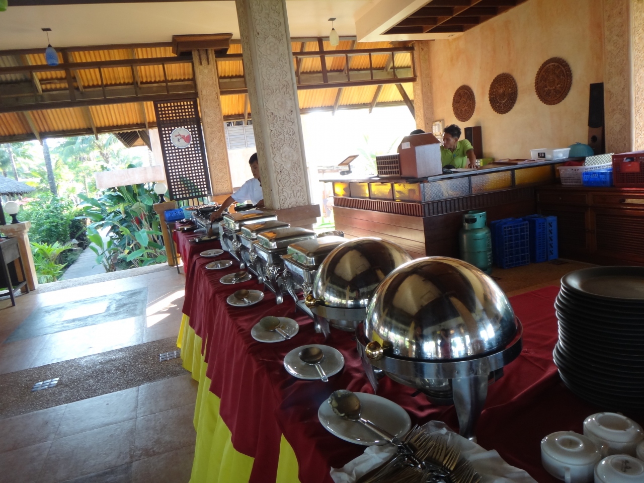 朝食はビュッフェではなく、セットメニューから選び、作ってもらいます。どのメニューもおいしかったです。量も多く、朝からおなかいーっぱい。昼間は食事をする人たちでとても賑わっています。また、夜はBBQもでき、ファイヤーダンスも行われますよ。