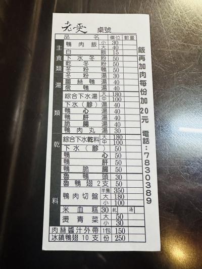 北港はグルメで有名な町。その代表的な料理の1つがアヒル肉(鴨肉)。台湾各地で食されるもので、南部においしい店が多い。老受は地元客の利用も多く、並ばないと食べられないことが多い。心臓や肝臓などの内臓料理も提供されているが、普段これらを食べ慣れていない場合は、普通に鴨肉飯や生姜鴨肉スープなどを注文することを勧める。それから、並ばずにすぐに食べたいときは、開店時間少し前に行って並ぶといいと思う。1人だと入りにくい雰囲気があるが、気にせず利用したい(気になる場合はテイクアウトも可能)。