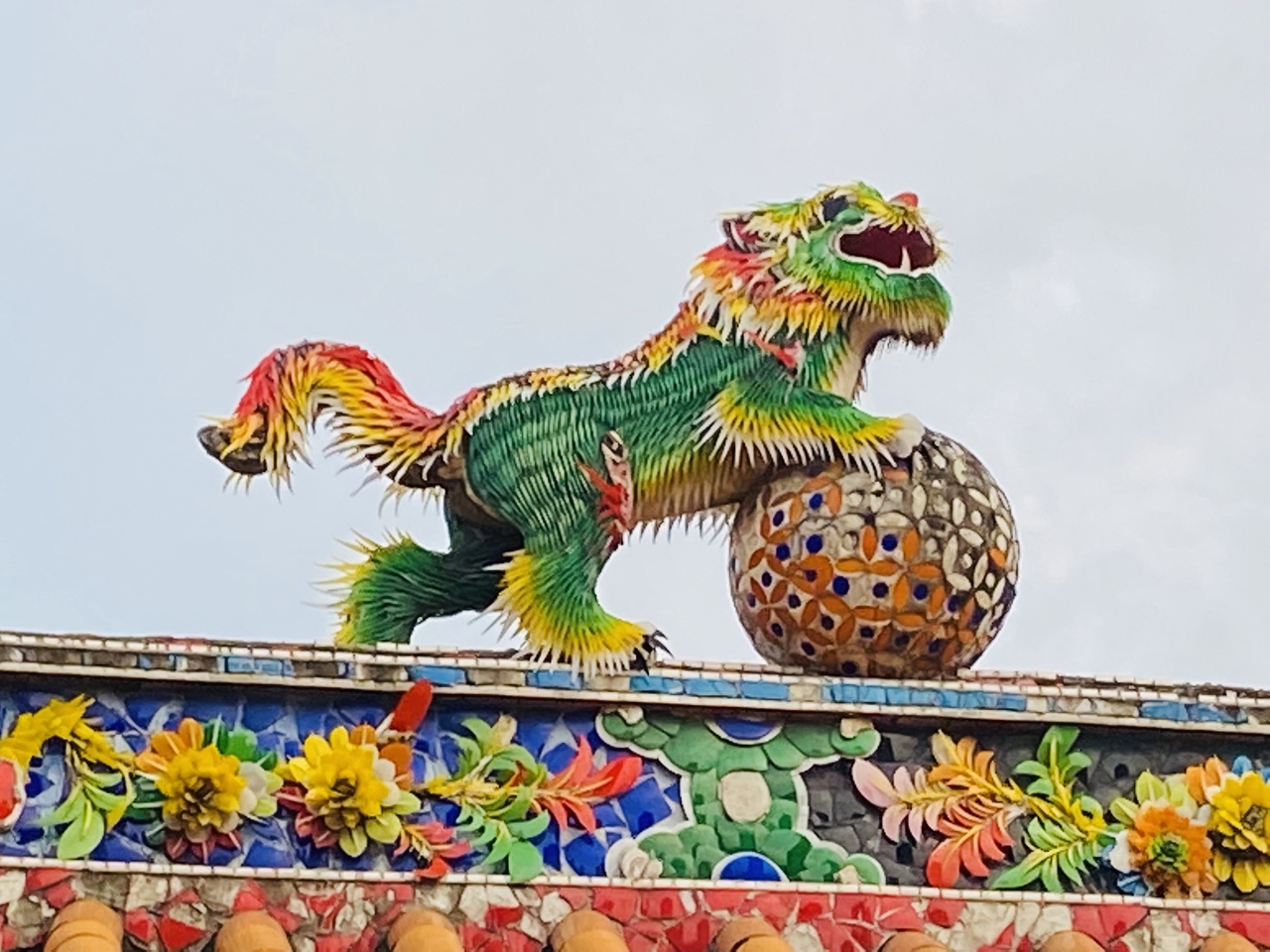 南天宮から徒歩で10分以内のところにある、三級古蹟の樂成宮。清朝乾隆年間に台湾へ移民してくる際に、湄洲天后宮の「老二媽」金尊を携えてきて、それをお祀りしたのが、この廟の起源。主祭神として天上聖母を祀る他、月下老人、華陀、玉皇上帝、三官大帝、觀音佛祖、註生娘娘、文昌帝君、財神爺なども副祀している。存じ上げている芸術家が手がける作品があるから、ここをわざわざ訪れたのだが、その甲斐が十分に感じられた。屋根の上の装飾、柱に彫られた龍など、見るべき芸術品が多い。