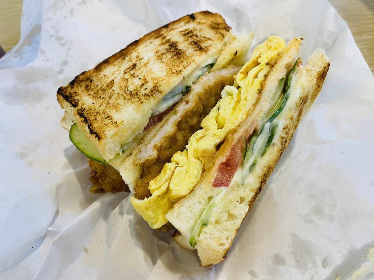 炭焼きサンドイッチ店「三多一吉(サン・ドウ・イー・ジー)碳烤三明治」。住宅街にある人気店で、利用した日も客足が絶えなかった。オーダーしたカツサンドはボリュームがあり、朝食とするにはやや多めかもしれない。濃厚な味わいのアイスココアを一緒に注文する人が多い。以前の旅行記で紹介した、基隆中元祭の起源を有する老大公廟の近くにある。基隆駅から徒歩で向かうと、10分ぐらいを要する。滞在時間が十分にあり、のんびりした旅を楽しみたい人向け。