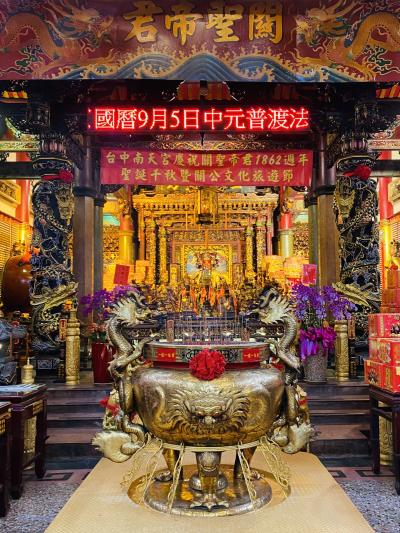 關聖帝君を主祭神とする南天宮は6階建てで、最上階の上に146mの高さの関羽将軍像がある。1952年に建設が始まり、翌年に前殿が完成したから、長い歴史を有する廟ではないが、信徒数は多い。最上階には財神洞があり、そこを一巡し善き行いを積むことで、財運向上を願う。ただし、1階以外を参拝できるのは17時までなので要注意!台中駅からだと、農夫市場のある新民街を進み、さらにそのまま南京路を歩いていけば、15分ほどで到着する。