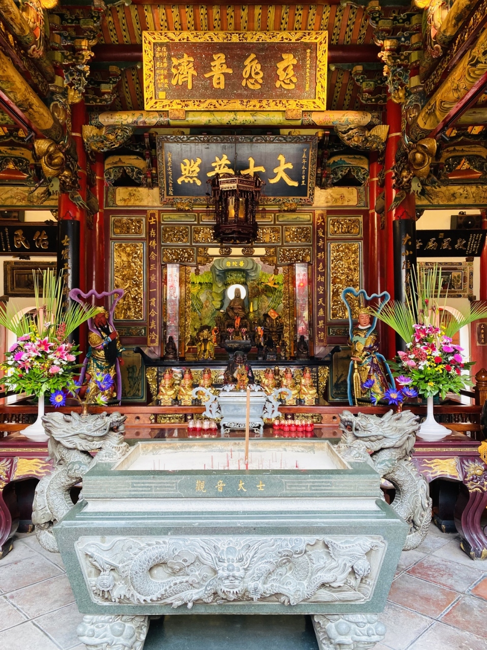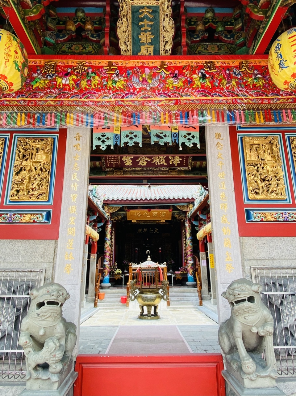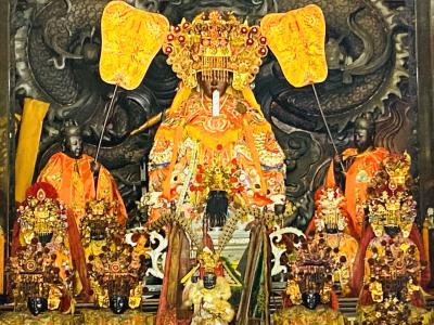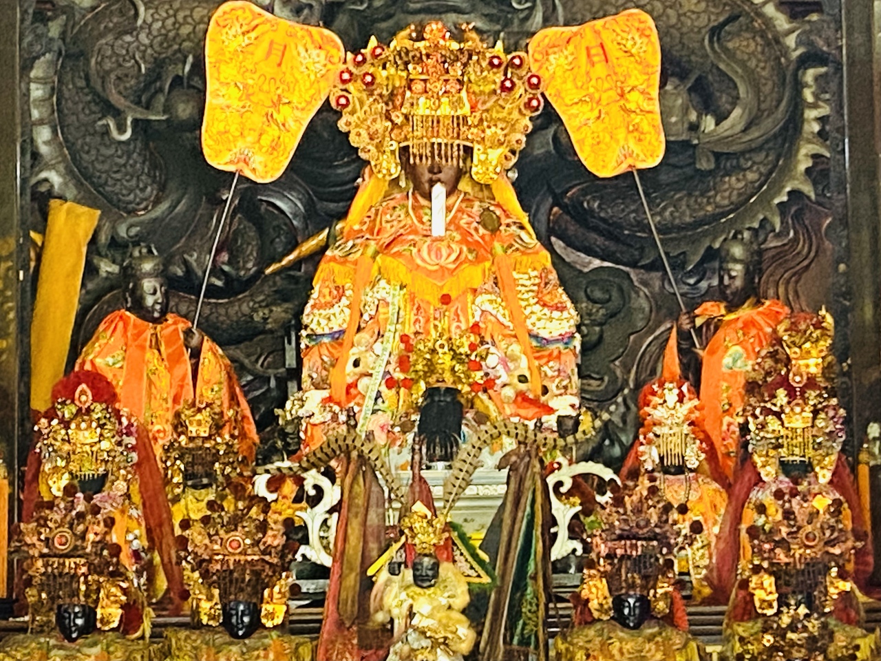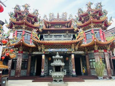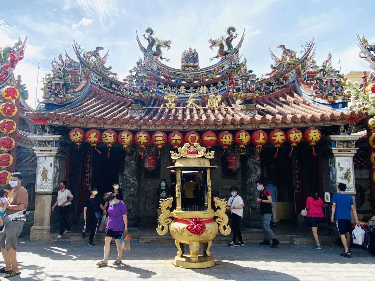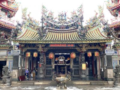 民雄大士爺廟の向かいにあるのが、台湾人にとって大切な女神である媽祖を祀る慶誠宮。1809年の創建であるが、1906年3月17日に大地震が発生して廟が傾き、植民政府はそれを壊し、道を拡張することにした。そのため、媽祖像は他の廟に長く祀られていたが、現在は立派な廟に祀られている。1階の正殿も階上の凌霄寶殿も精緻に造られていて、時間を忘れ見入ってしまう。また、屋根の上の飾りも至近距離で見ることができる。廟の入り口の炭焼きチキンの屋台が有名らしいが、訪れた時は昼間であったため、食していない。
