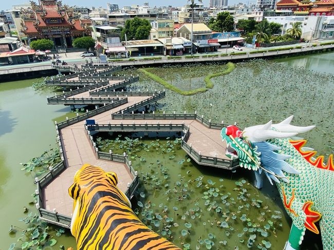 高雄観光の記事やパンフレットでよく紹介される左営蓮池潭。訪れる人はそう多くなく、ゆっくり楽しめる。龍の口から入ると、台湾人なら誰もが知る先人の孝行を表現した展示がある。これらも楽しみたい。龍塔の最上階から蓮池潭を見渡すことができる。この塔は道を挟んで前にある慈濟宮のもの。この道教寺院も見応えがあるので、ぜひ訪れたい。