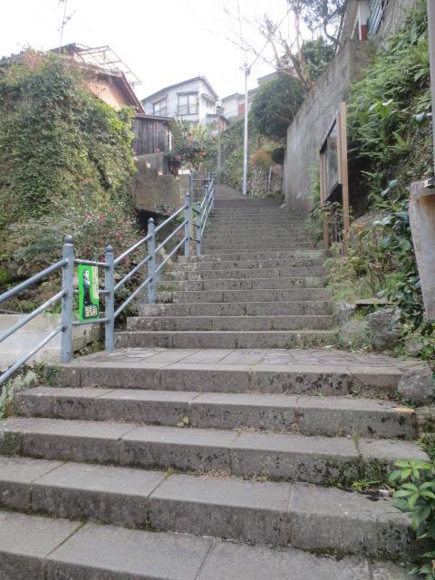 龍馬の足跡を訪ねて歩く道。しかし、それはいつまでも続く階段。体力が十分にあるのであれば、下から上ってくるのもよいが、そうでない場合は、バスで風頭まで行き、風頭公園の龍馬像から歩き始めるのがよい。ただ、下りであっても、膝が弱い人には厳しいだろう。しかし、龍馬好きであれば、長崎に行ったら、必ず行かねばならない場所だ。
