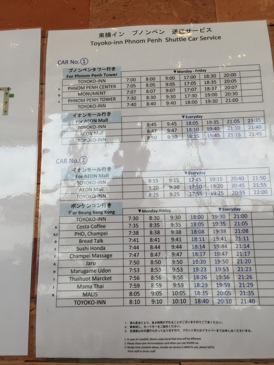 ホテルからシャトルバスが出ており部屋からフロントに電話すると乗れます。