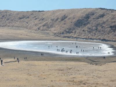 草千里の池には凍りが張っていてその上を多くの人々が歩いていた。