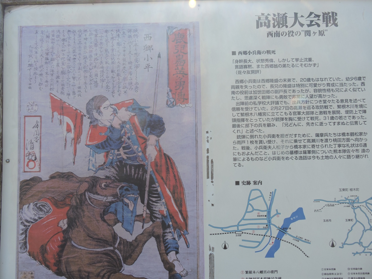 菊池川沿いに案内板があるのでそれを頼りにいけばわかる。小兵衛は薩軍一番隊一番小隊長として自ら陣頭指揮し、弾丸に胸を貫かれて壮絶な戦死をとげたという。