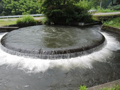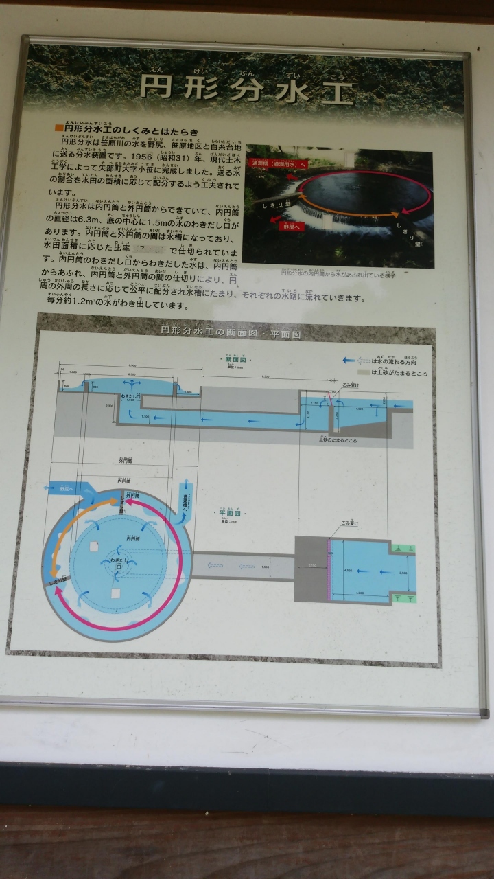 国の重要文化財「通潤橋」から約6㎞上流にある農業用水を分ける施設である。近くの笹原川から水を引き入れている。中央から水が噴き出し、農地面積に応じた割合で水が流れるように区分けが施されている。