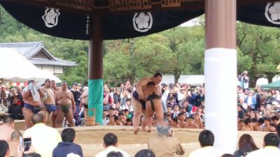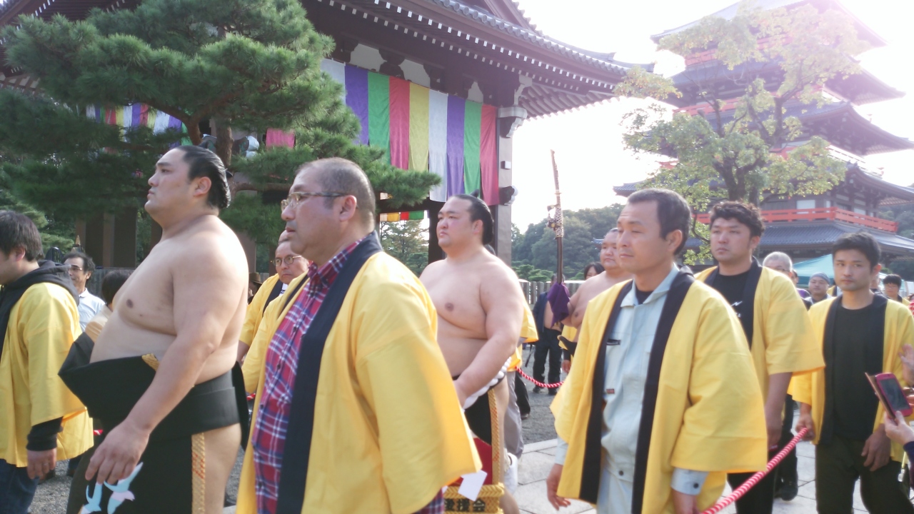 毎年11月3日に行われている。9時から小学生の奉納相撲大会、10時から関白法要、13時より柴燈大護摩祈祷、15時から横綱奉納土俵入り、15時30分から子ども力士と関取のかかりけいこなどがあって多くの人たちでにぎわっていた。土俵入りは人が多くて後ろからしか見られなかったが、子どもたちとのかかりけいこが面白かった。- 旅行時期