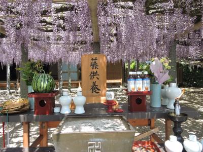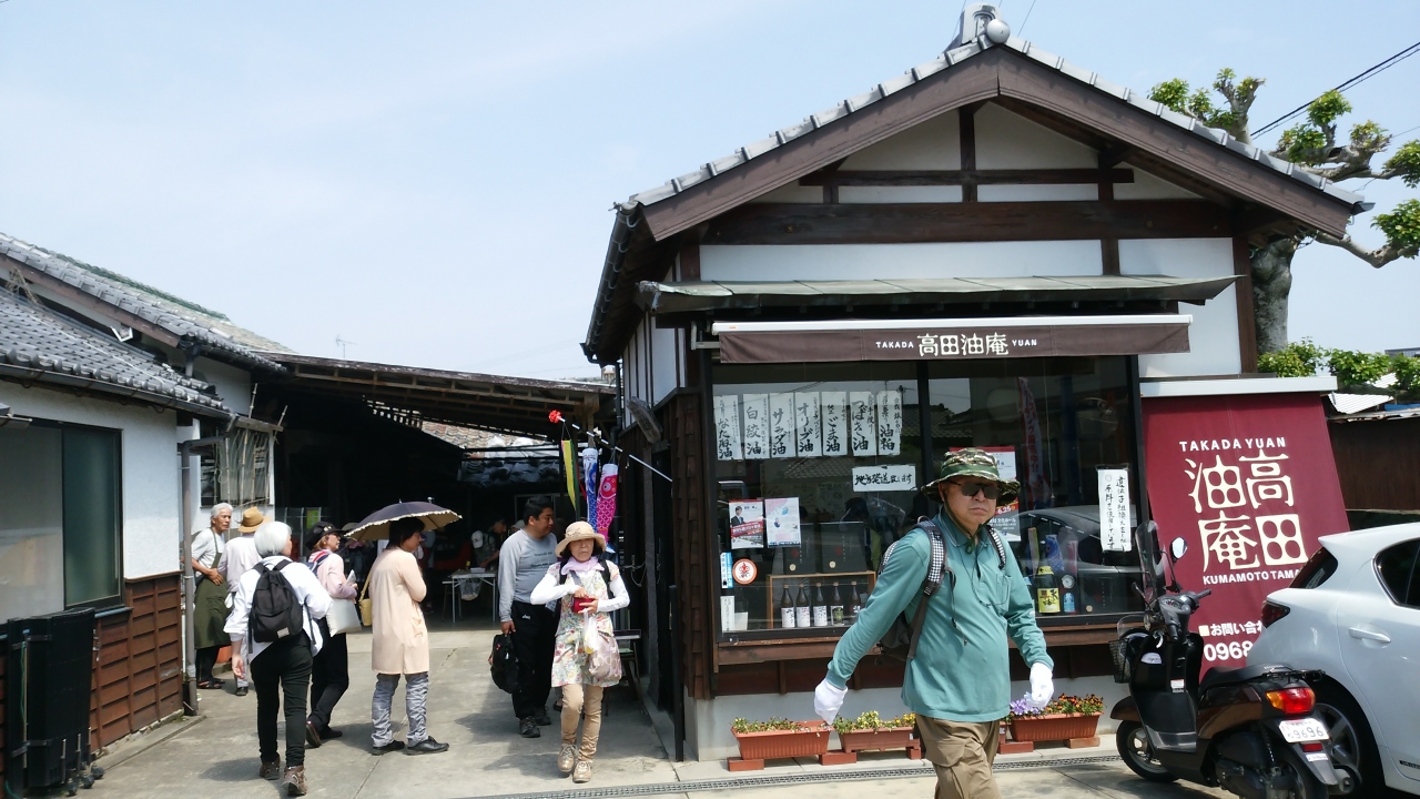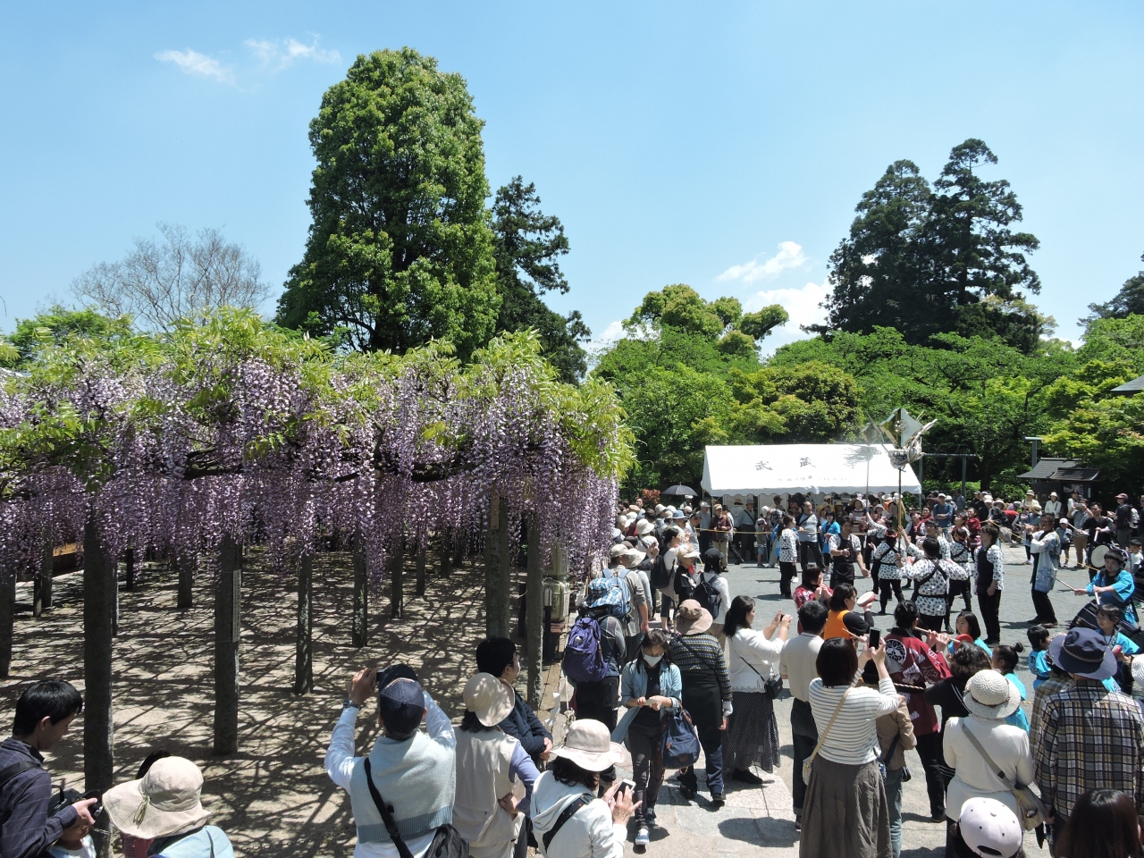 そのあとちょっと移動したら、菅原道真公が自分の無実を訴えた「御自作天満宮」がありここでは琴の演奏などもあっていた。そのすぐ下には「武蔵寺」がありここには「長者の藤」の花が満開で稚児まつりや太鼓演奏などがあっていて多くの参拝者で賑わっていた。その後二日市八幡宮からゑびす醤油に行った。ここでは醤油を使ったいくつもの漬物などの試食をさせてもらった。そしてすぐ近くの大賀酒造では試飲をさせてもらった。