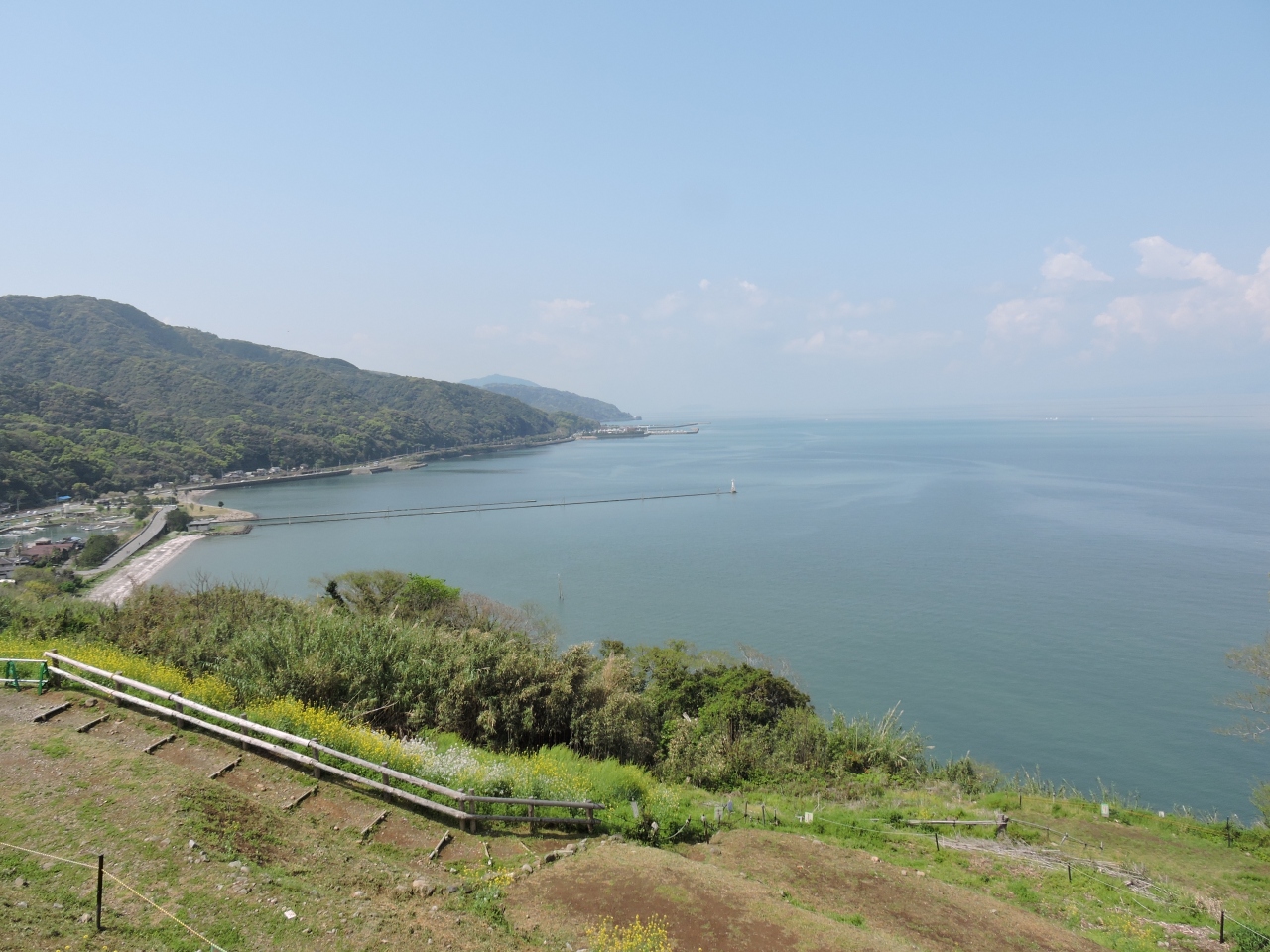 JR九州ウォーキングで網田駅から約9kmを歩いた。まず網田神社にお参りし、網田焼の窯元跡、工房せいや窯、蒼土窯工房(横浜市磯子総合庁舎・トヨタ車体本社玄関の陶壁などを数多く製作する)など山手の焼物の里散策をする。そのあと海岸沿いの山に登り島山展望所に行く。かなりの山道である。ここは日本渚百選(干潟と夕日の名所)の御興来(おこしき)海岸が一望できる眺めの良いところである。