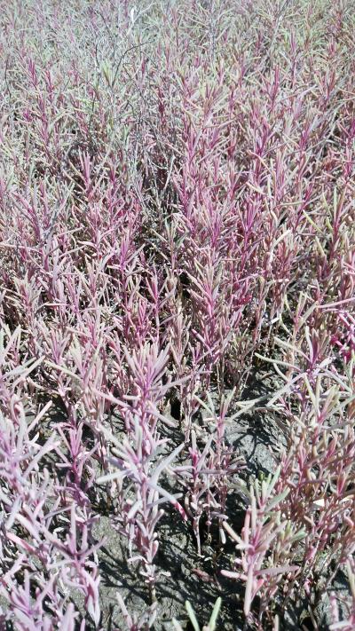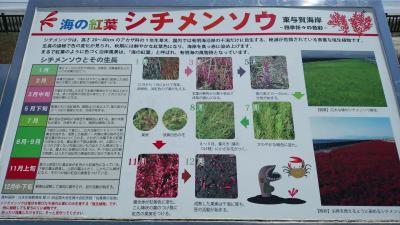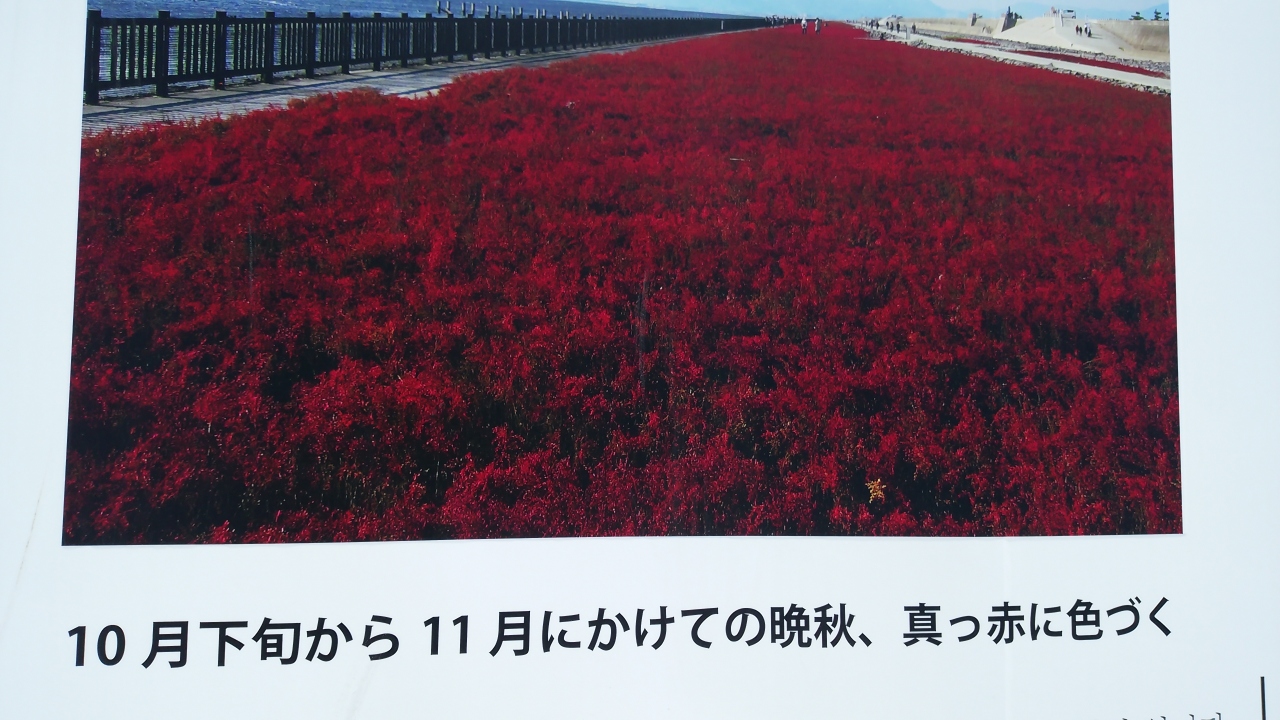 シチメンソウは春の目立ちの時でまだまだであった。これは秋きの真っ赤に染まるときが美しいのである。秋に来るとこの紅葉したシチメンソウがきれいである。- 旅行時期