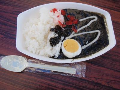 次に三池港浪漫フェスタ会場まで歩いて行き祭の様子を楽しんで食事をする。ここでこの日限定の黒いカレー石炭カレーを味わった。本当に黒い色をしているカレーである。