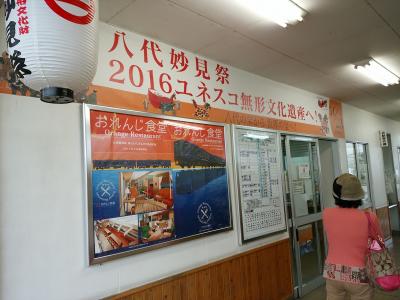 駅には八代の伝統的な祭りとして有名な「妙見祭」の大きな看板があり、日本製紙工場の煙突とともに八代のランドマーク的な意味もある。