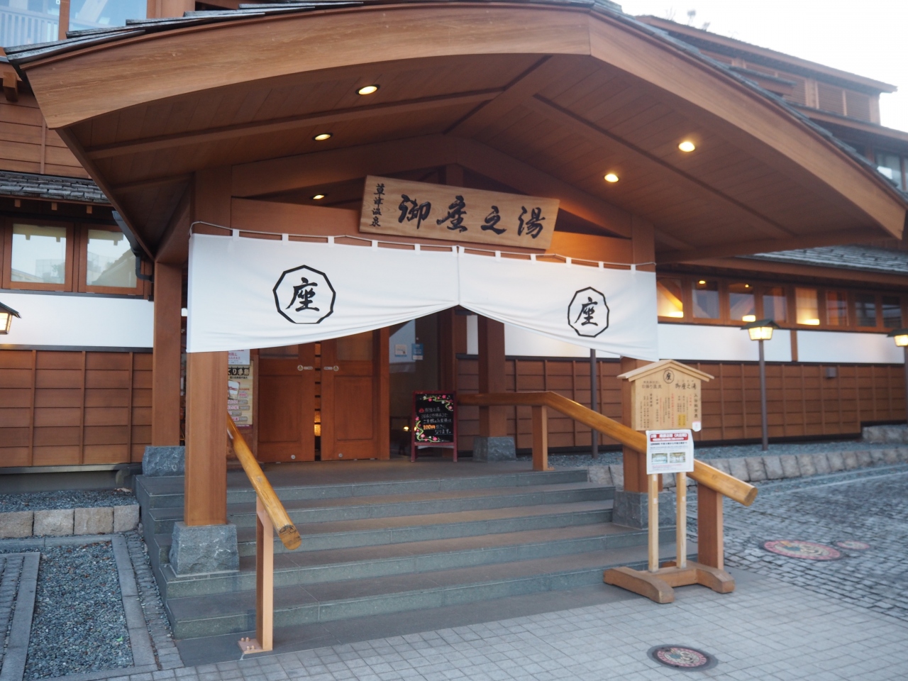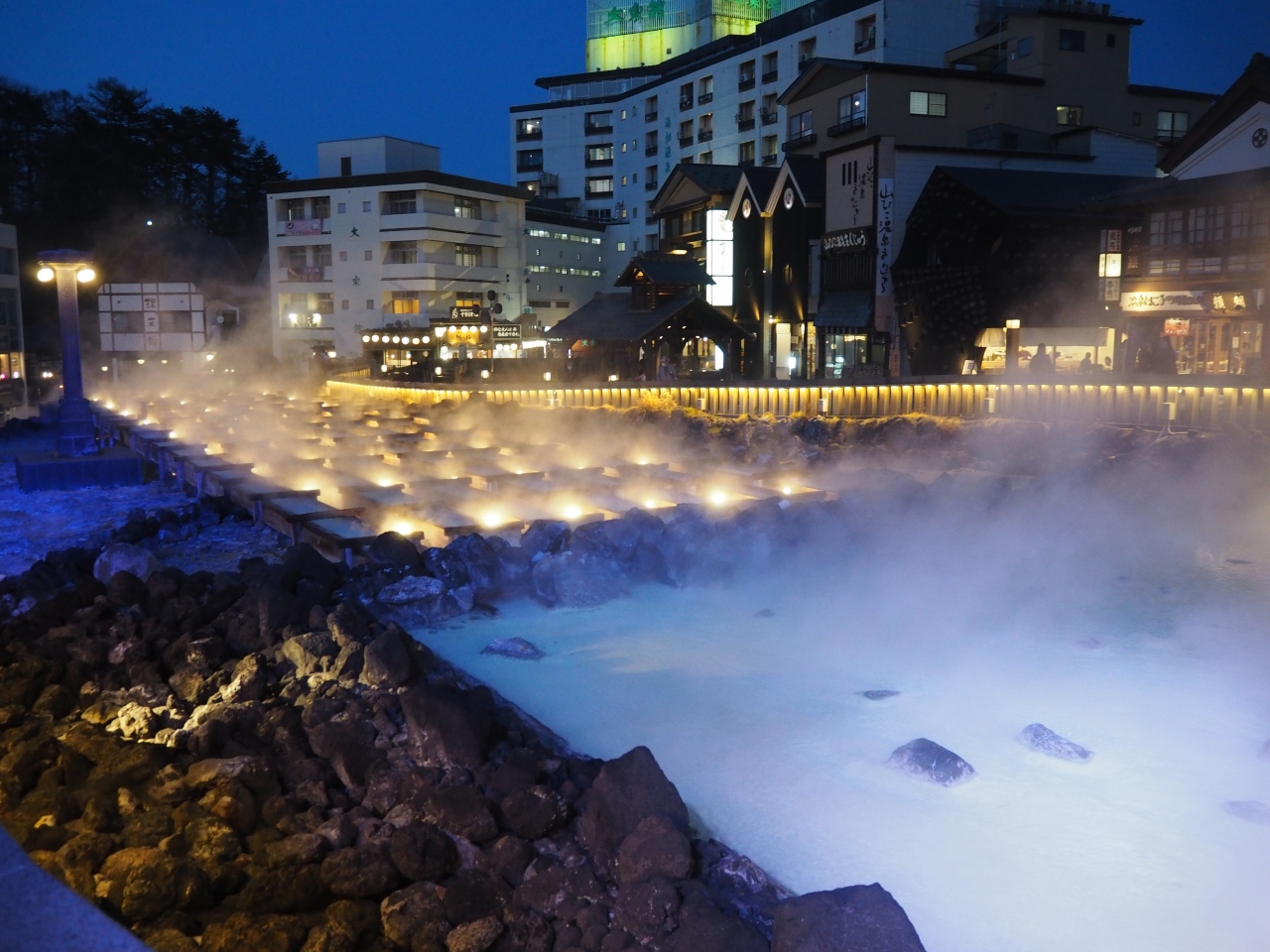 日没後に湯畑はイルミネーションが点灯されます。夕方の気温が下がり、湯畑からの湯けむりが増えて、紫色やオレンジ色のイルミネーションが湯けむりにあたり、独特な幻想的な雰囲気があります。観光客も湯畑の周りに集まり、にぎやかな雰囲気が増します。夜の散歩にも楽しみが増えます。