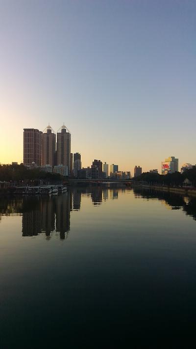サイクリング途中、愛河を渡る橋から朝焼けの風景をパシリ。