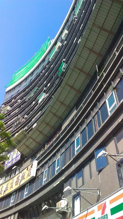 台南駅到着!駅前ロータリーに丸みを帯びたホテル。ホテル前のバス停より、...