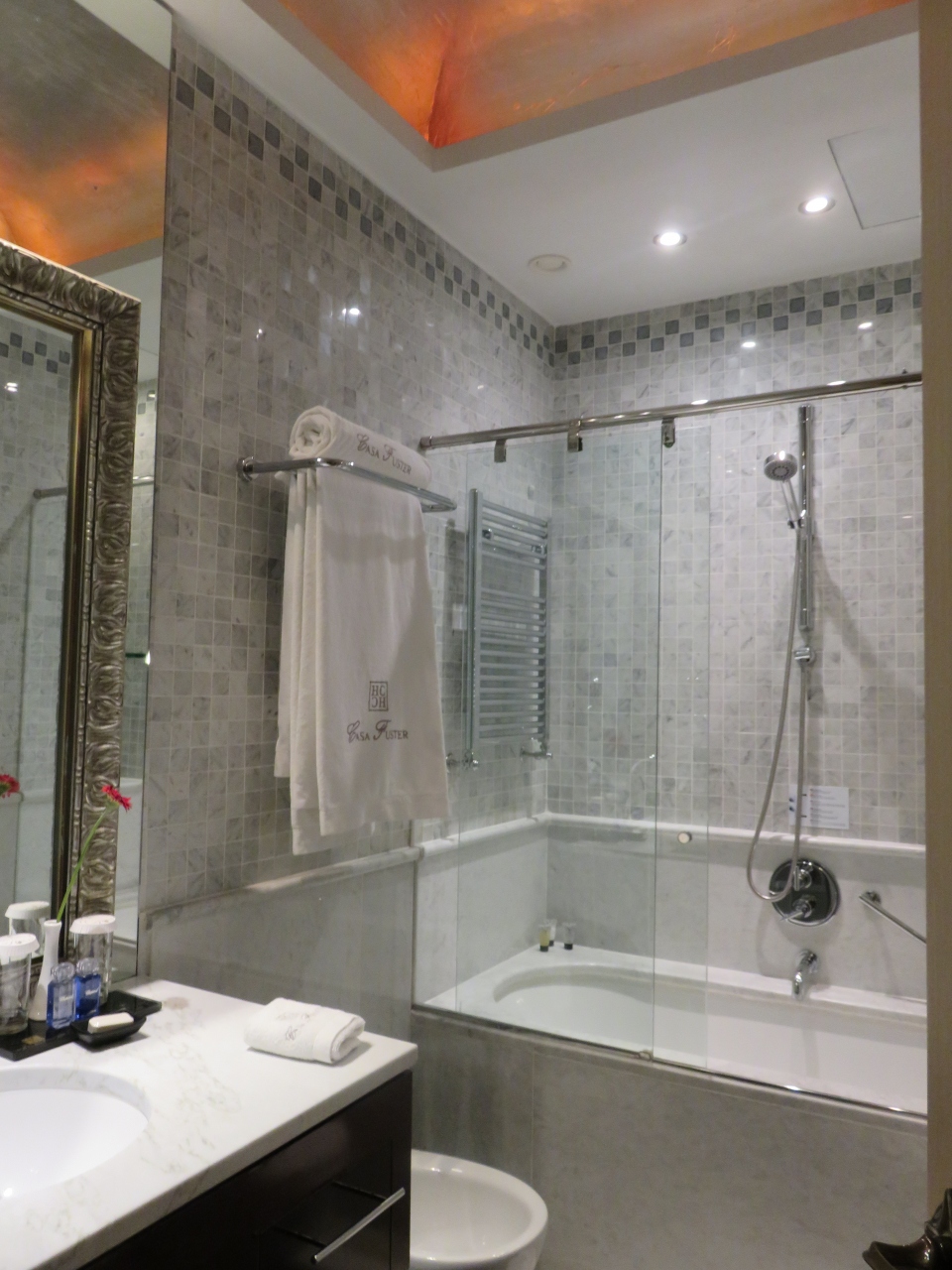 アメニティも充実。清潔なバスルームの浴槽の仕切りはシャワーカーテンではなく引き戸のガラス製タイプははじめてでした。