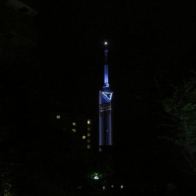 8000枚ものハーフミラーで覆われた正三角形のシャープな外観「ミラーセイル」が点灯するとブルーの光にタワー全体が包まれ美しいフォルムで魅了されます。