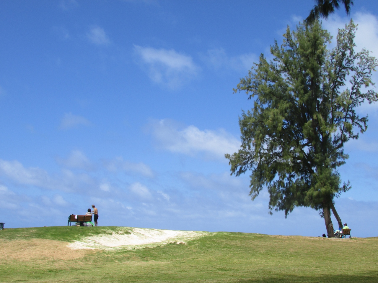 大きな芝生の公園の丘の先にカウアイビーチがあります。
