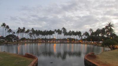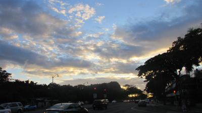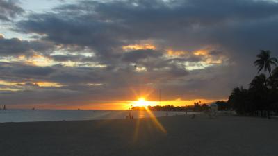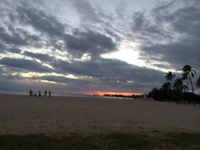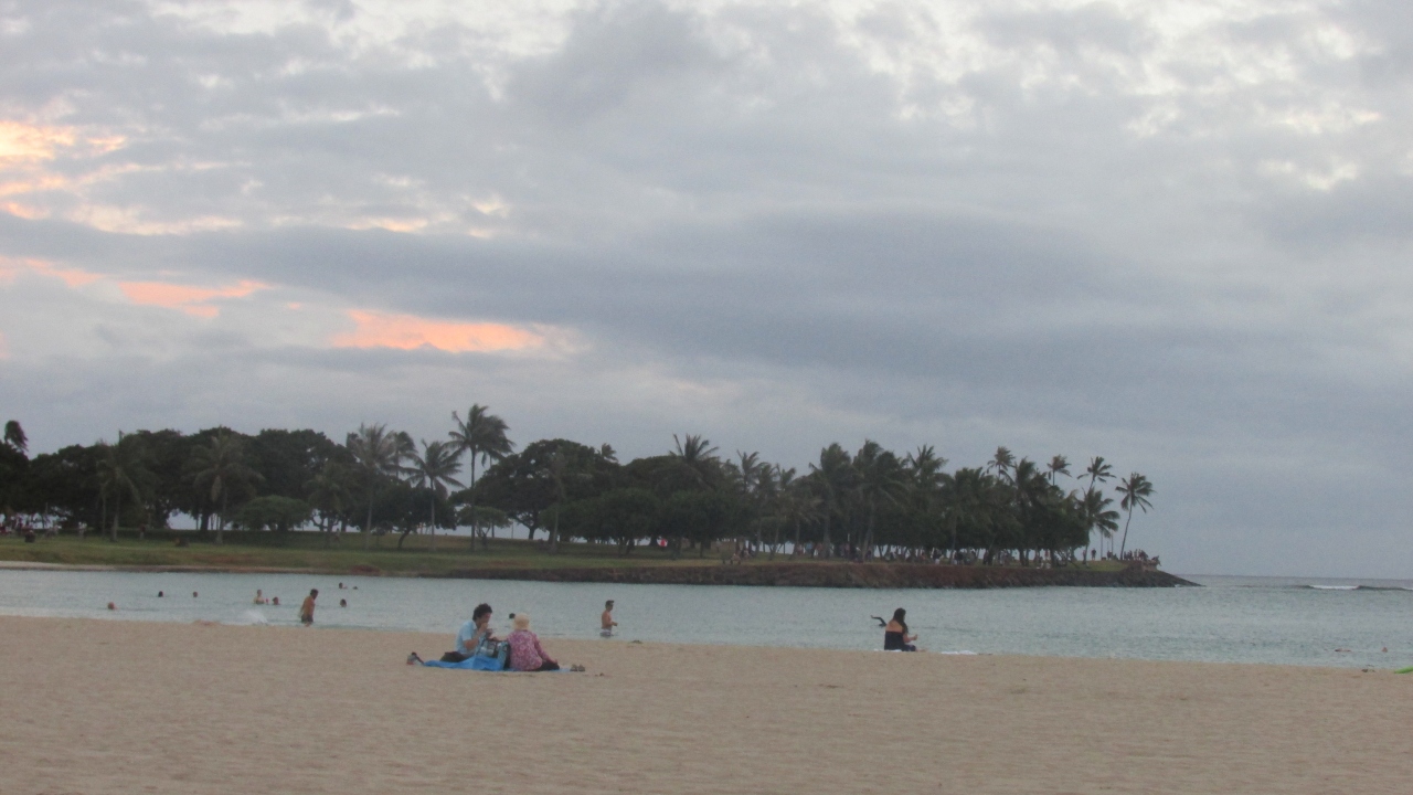 ワイキキの混雑を避けたい人は、近くにあるこのアラモアナ・ビーチにやってくる人が多いそう。お弁当を持って夕陽デートしてる方もいらっしゃいました。