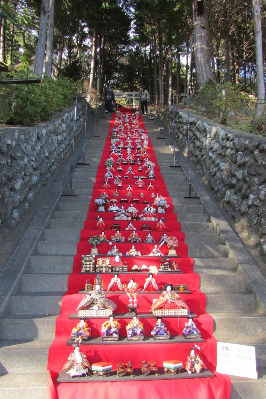 参道の石階段117段に368体の雛人形と7対の雛のつるし飾りを展示しています。