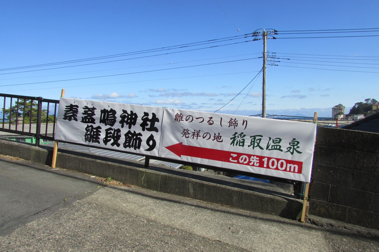 この素盞鳴神社の階段を使い、雛人形と雛のつるし飾りを