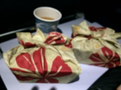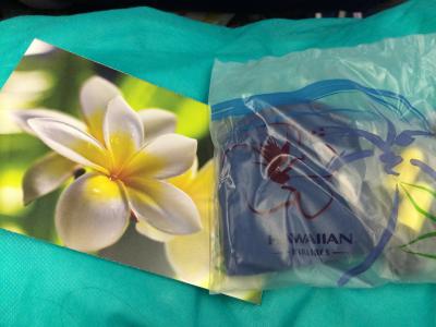 帰国便はハイビスカスのハンカチの包みの機内食はかわいかった