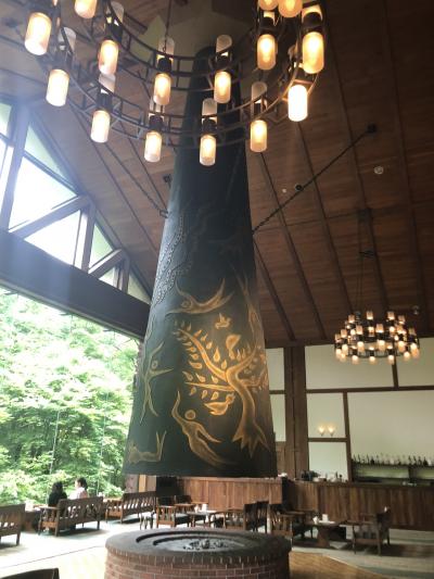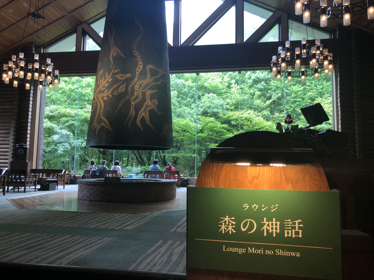 正面は大きな素通しのガラスから奥入瀬の森林を斜景に 森の神話というラウンジがあります。時間に余裕がある時にゆったりとオリジナルのスィーツを愉しむには絶好のスポットです。