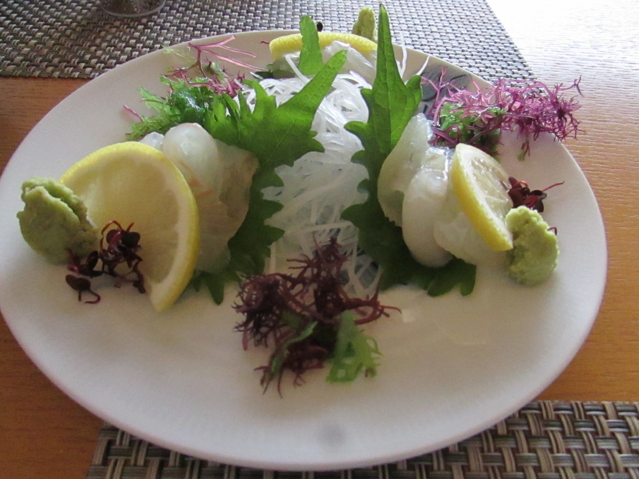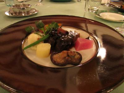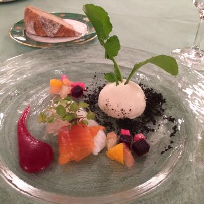 夕食の最初の35000円グリーンの大皿は見事で、見た目の盛り付けは素敵でしたが味はいまひとつ合いませんでした。