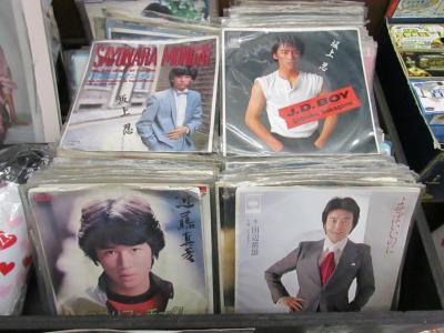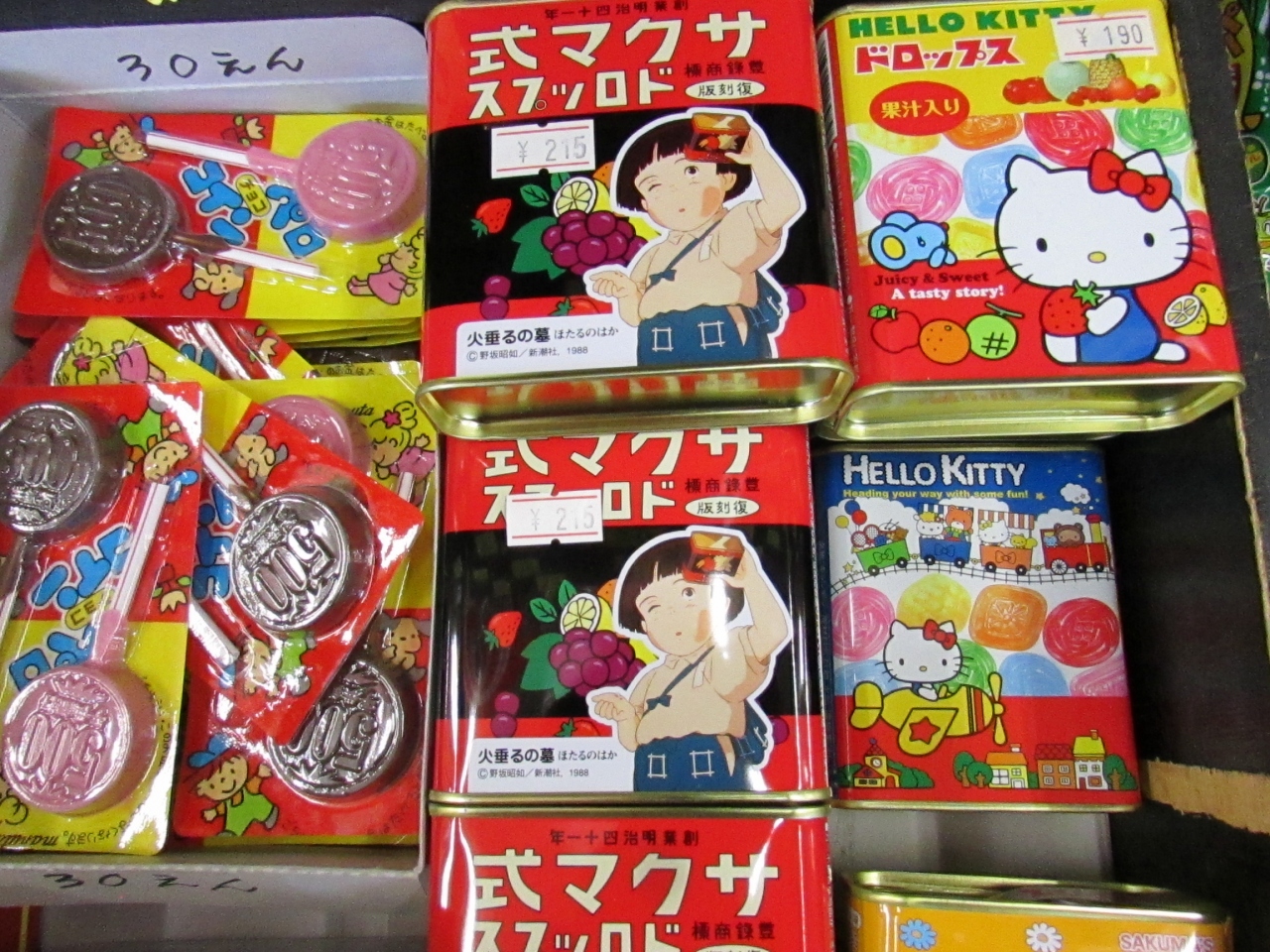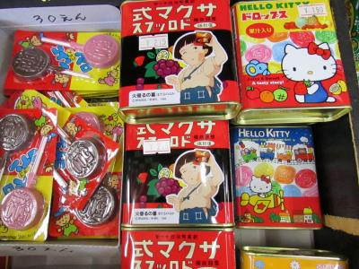 ブリキのおもちゃやメンコ、昔のアイドルの写真など、