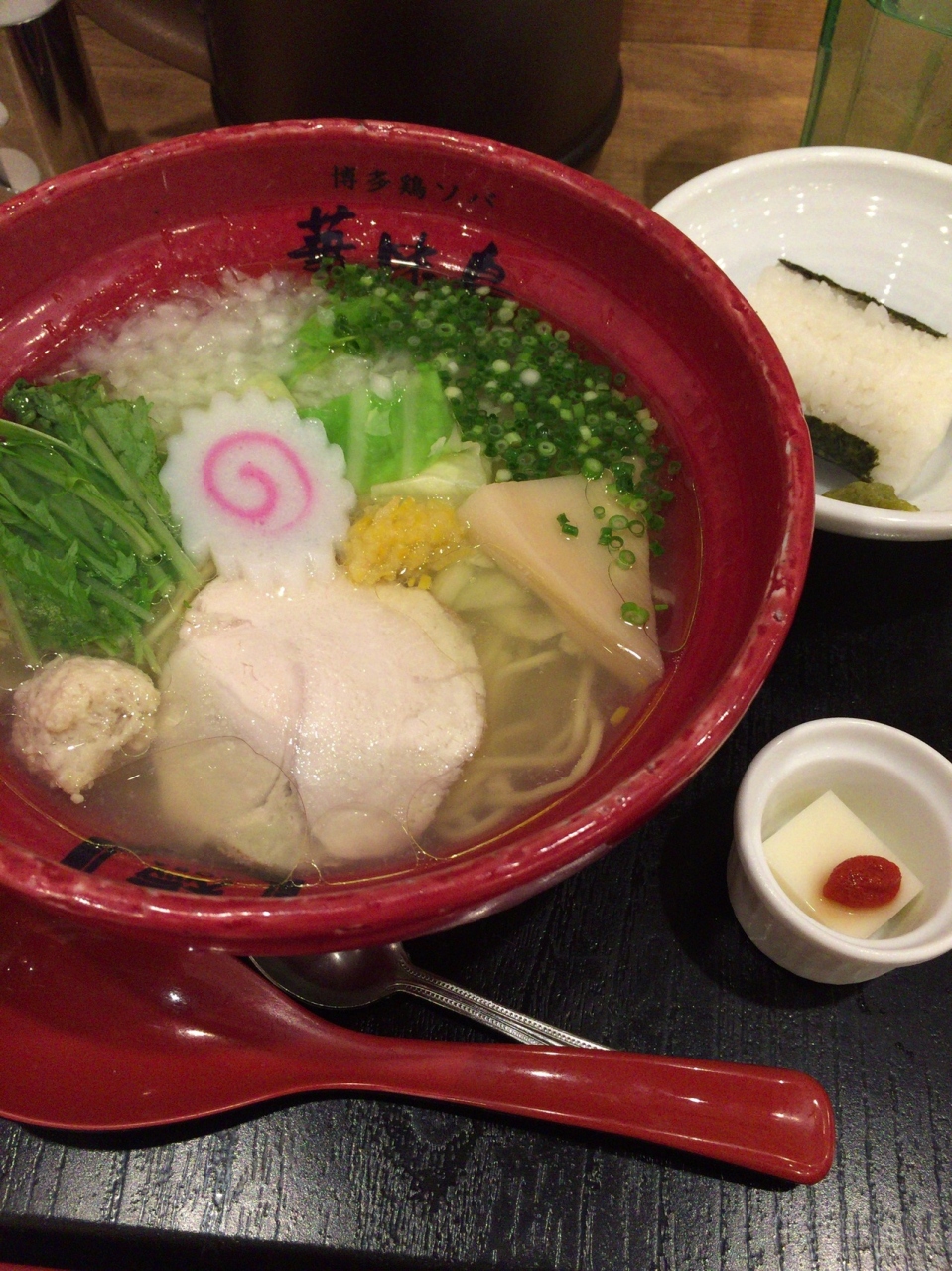 博多華味鳥が出店した鶏肉スープの和風ラーメン店です。数種類ありましたが、水炊きスープのラーメンを食べました。あっさりしているようで、結構コクがありました。単品で頼みましたが、昼時だからか、おにぎりがサービスにつきました。おにぎりにスープをかけて、雑炊風にして食べました。麺より気に入りました。