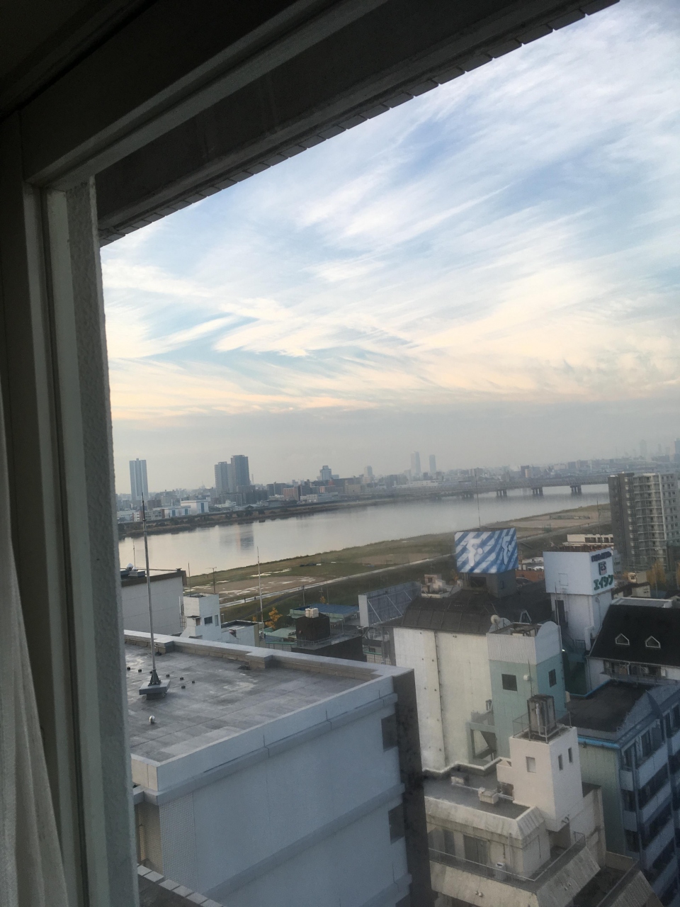 大阪梅田から阪急電車で二つ目、十三にあるホテル。十三は阪急線のすべての電車が止まるのでとても便利です。ホテルは駅からそれほど離れてはいない(10分弱)のですが、ホテルに近づくと、ファッションホテル(いわゆるラブホ)だらけ。そのせいなのかコンビニの数も多いです。