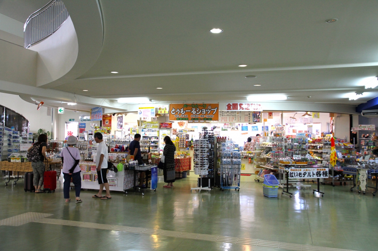 お土産屋さんは、定期便の発着に合わせて開店します。喫茶店「旅果報」がありますが、休憩時間があるので利用時間に注意が必要です。