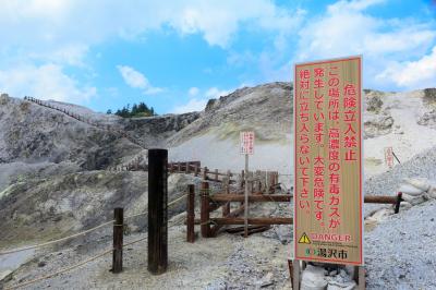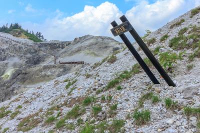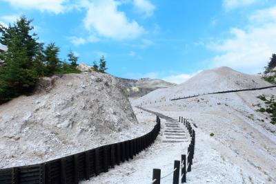 川原毛地獄は、ほんと真っ白な山それと対比して遊歩道には黒の木の杭があり