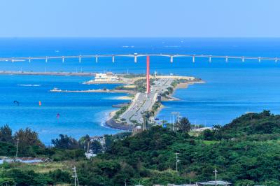 海中道路の真ん中にある道の駅の歩道橋から海岸を見ると海の中に浮かぶ砂浜も見れます- 旅行時期