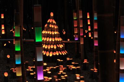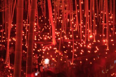 夜真っ暗になった公園内の竹林に、5000本ほどの竹灯籠の明かりが映し出すその光景はまさに竹取物語の世界を連想させます。