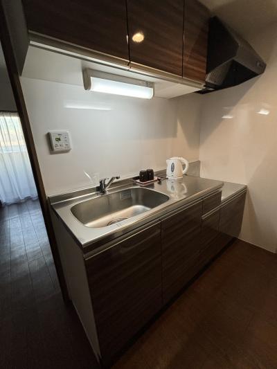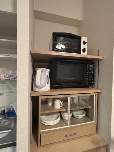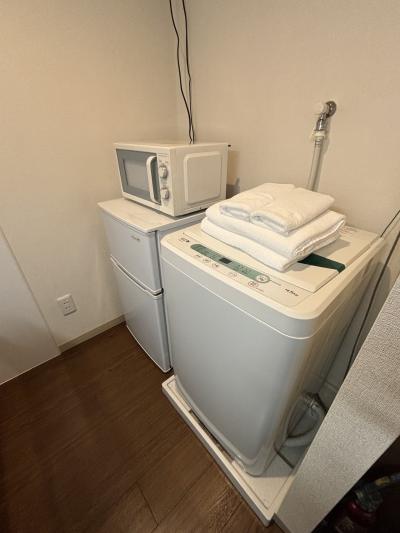 キッチンもあり、簡単な調理可能です。乾燥機は独立しているもので、乾くのが早くて便利でした。洗濯洗剤は2袋用意されていました。足りなくなったら2階の無人売店で購入可能です。無人売店では飲み物やお菓子、冷凍食品も売っていました。